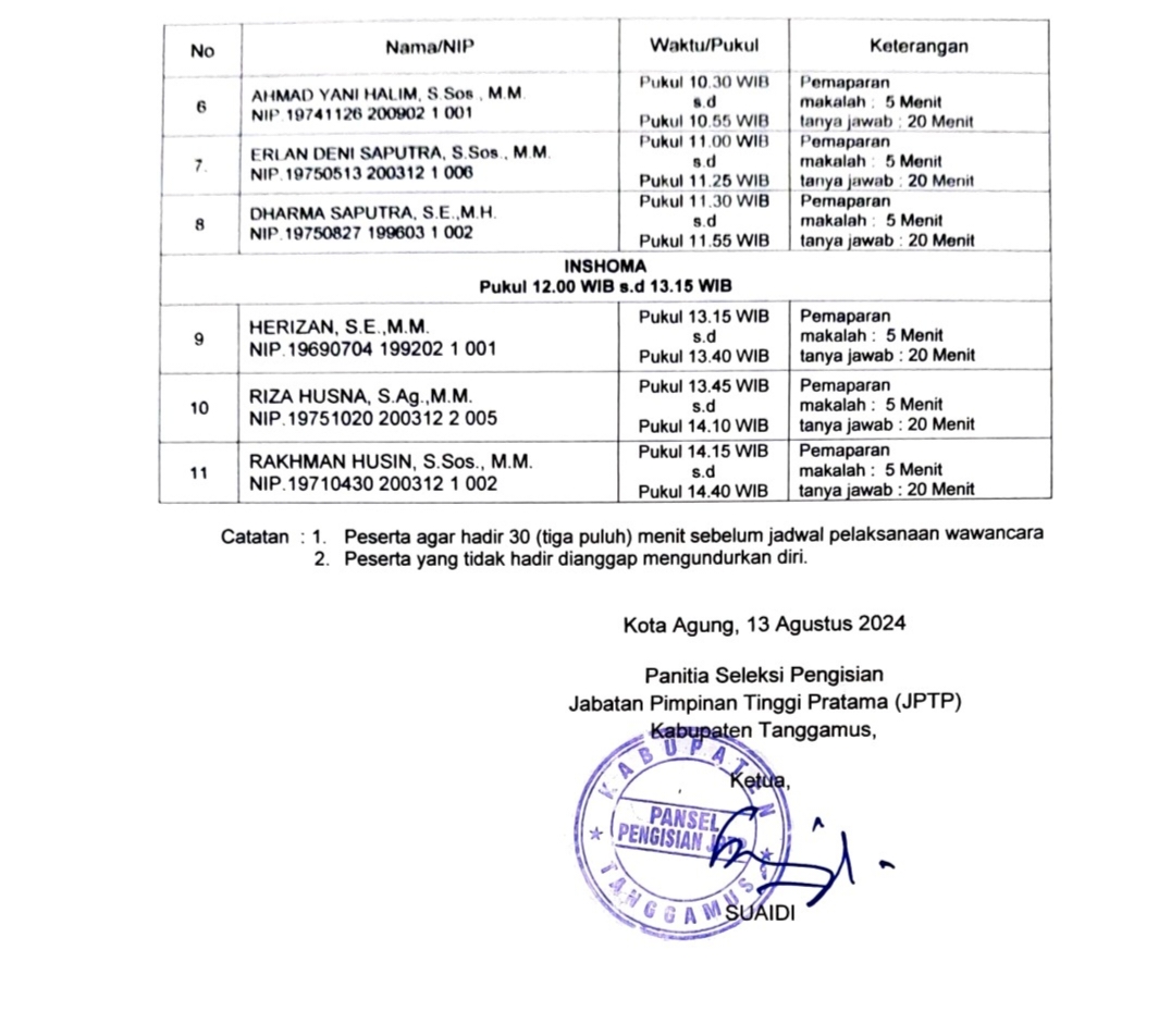 ” Kemudian setelah mendapat rekomendasi dari BKN dan Menpan RB, juga persetujuan Mendagri dan Gubernur Lampung. Barulah ke 7 pejabat hasil Selter JPTP itu akan dilantik oleh Pj Bupati Tanggamus Mulyadi Irsan, Jelas Edwinsyah mewakili Plt Kepala BKPSDM Tanggamus, Bambang Probo Sampurno, melalui pesan tertulisnya. Jumat 13/9/2024.
