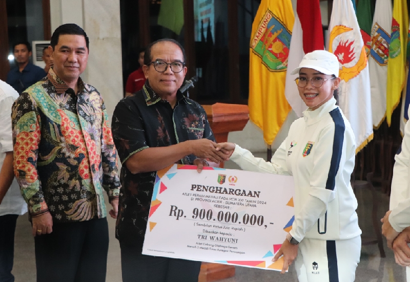 Dalam kesempatan tersebut, Pj. Gubernur menyerahkan bonus pembinaan dengan nilai total Rp19,98 Miliar kepada 102 orang atlet dan 67 pelatih dari 25 cabang olahraga.