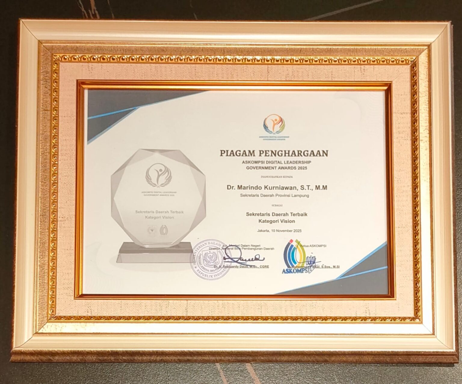 Buat Harum ASN Lampung, Marindo Raih Penghargaan Sekda Terbaik di Indonesia Kategori Vision